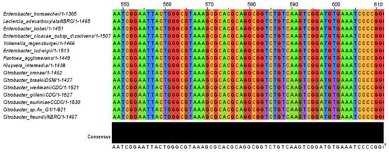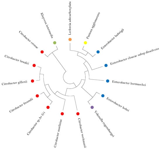 The phylogeny tree shown in a circle, with 500 bootstrap replicas, shows us an ordered panorama of the phylogeny inference of the new strain, confirming the relationship with Citrobacter freundii and placing the entire Citrobacter genus on one side, the genus Enterobacter on the other, and Leclercia adecarboxylata, Yokenella regensburgei, Pantoea agglomerans, and Kluyvera intermediate in different branches. See Figure 5 and Figure 6.