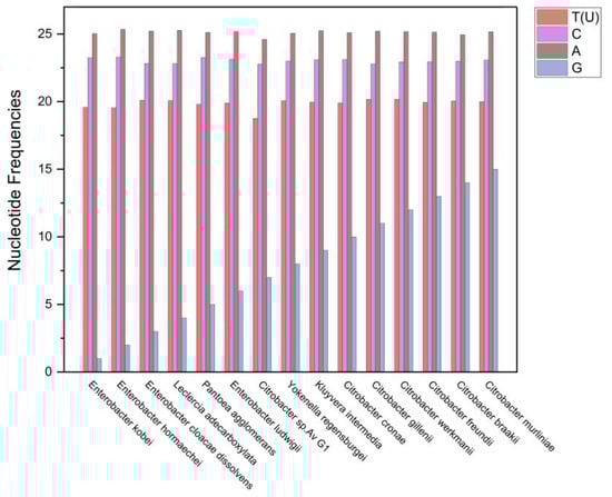Figure 2 shows the alignment of sequences in JalView, showing the most conserved regions among the organisms that had the highest percentage of identity and ranging from 550 bp to 610 bp. In this sense, Figure 3 shows the nucleotide composition of every bacterial strain analyzed by JalView showing thymine T(U), cytosine (C), adenine (A) and guanine (G) frequencies content.