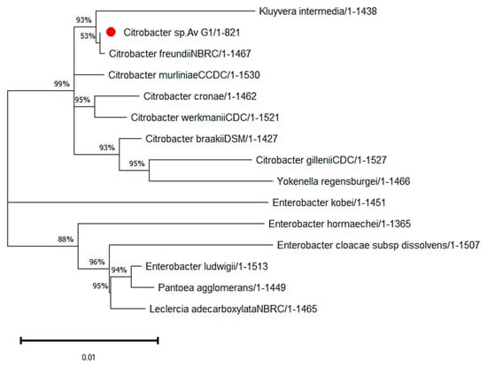 To perform the bioinformatic analysis, the RDP database was used, making use of the “classifier” tool to identify, at the taxonomic level, the genus of the strain []. Then, the 16s RNAr gene sequence of the new Av_ G1 strain was submitted to GenBank, a global gene bank, and the National Center for Biotechnology Information (NCBI) BLASTn Software was used to determine the similarity with other strains in the bank.