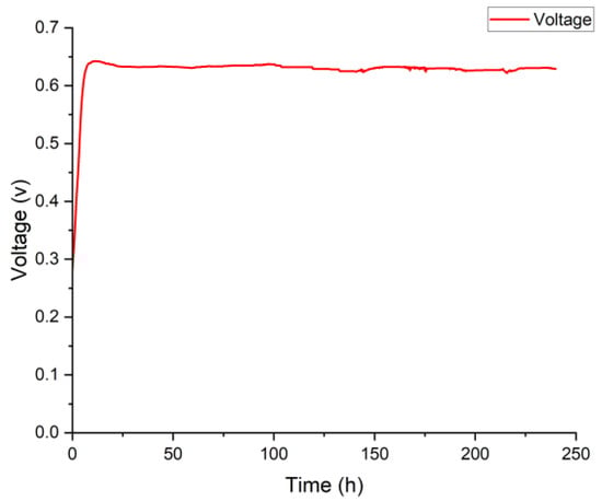 In Figure 7 the output Open Circuit Voltages (OCVs) are shown during a period of 240 h, an evident increase is observed until 11 h with a maximum of 0.645 V; after 20 h the voltage production remained constant between the values of 0.612 V and 0.640 V, these values are within the ranges reported by other authors who established similar configurations [], this initial stage of increasing trend until 11 h is due to the abundant availability of food that the bacteria received in their anodic behavior [], for this reason the bacterial colony grew exponentially. Furthermore, the rapid activation observed is due to the previous conditioning stage that Av_G1 passed through making possible this exponential behavior. We can assign to this new strain the capability to withstand copper stress, to oxidize poultry manure, and the electrogenic capacity to the previous conditioning stage explained in part 2.5 of this research.