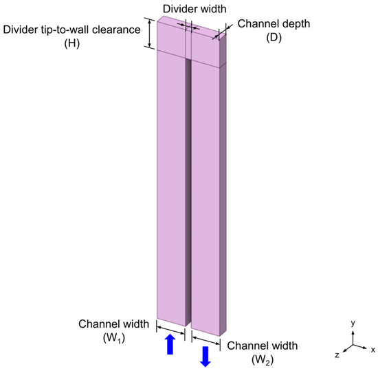 For the parametric study, we selected three design variables—channel width (W2), divider width, and divider tip-to-wall clearance (H)—as the main factors affected by the limited space of an airfoil. The variables varied from −25% to +25% of the initial value (Table 2), and the inlet channel was left unchanged to maintain the same hydraulic diameter.