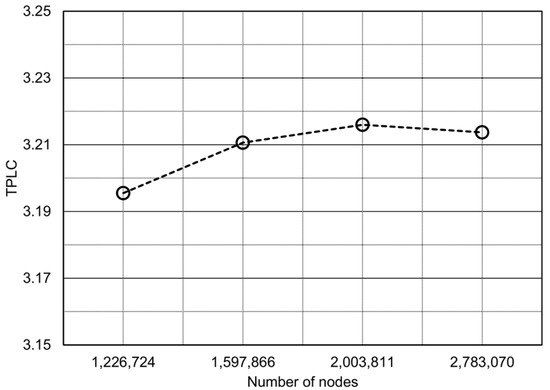 Four sets of meshes were generated, and the relative deviations of the TPLC decreased as the number of nodes increased (Figure 4), so the second set of 1,597,866 nodes was chosen for efficient computation and to maintain a certain level of reliability.