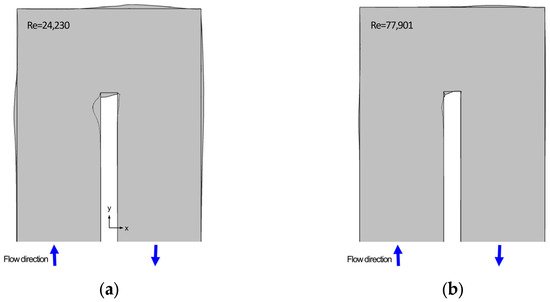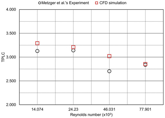 The reliability of the simulation must be verified to understand the flow characteristics within a sharp 180° turn in a rectangular channel. The simulation results were compared with the experiment of Metzger et al. [2] using the model described in Figure 2 for four Reynolds numbers (14,074, 24,230, 46,031, and 77,901). Figure 5 and Table 1 show the comparison of the TPLC; in most cases, the percentage difference was less than 6%, except for 11.7% at a Reynolds number of 46,031. We considered the simulation method to be reliable, as it was in good agreement with the experimental results.