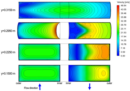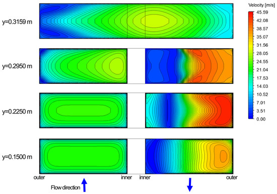 Figure 7 shows, for a representative Reynolds number of 24,230, the velocity contours in the cross section at different heights; the left and right sides of the figure represent the upstream and downstream flows, respectively. In the upstream, as the flow approached the top of the divider, the velocity was highest near the right sidewall, and strong circulation occurred near the left edge in the tip-to-wall clearance region (y = 0.3159 m). In the downstream, the flow accelerated near the left sidewall in the direction of flow, so strong circulation and stagnation were observed near the right sidewall, thereby explaining the flow characteristics of a sharp turn. Widespread stagnation of the flow can cause high pressure drops in the passage; therefore, a change in geometry would be expected to have an effect on the pressure losses.