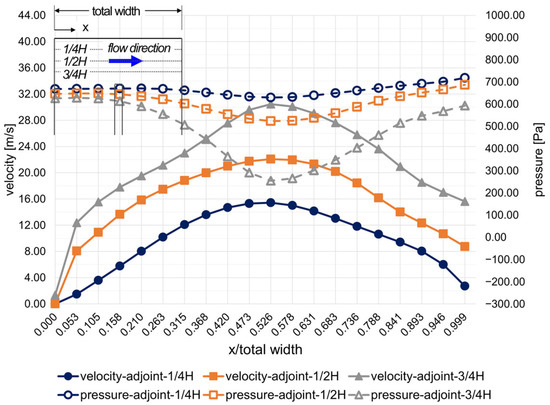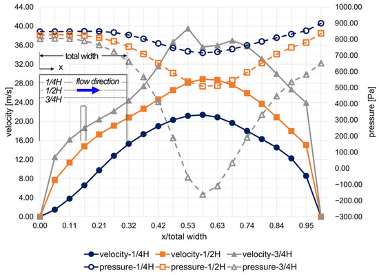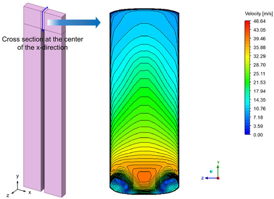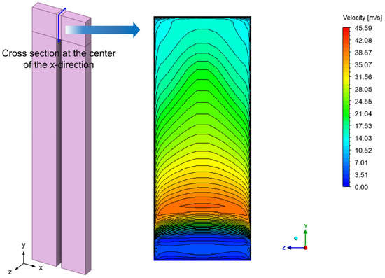 Figure 16 shows the velocity contour at the center of the x-coordinate; when compared to Figure 8, the velocity was the lowest near both ends of the top of the divider, and the high velocity region moved closer to the top of the divider.