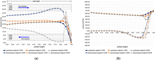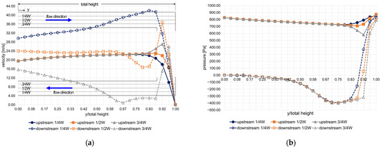 Flow characteristics of the upstream and downstream channels (Re = 24,230): (a) velocity distribution; (b) pressure distribution.