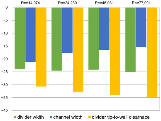 A total of 15 design points for each Reynolds number were generated by CCD, and the calculations were performed using ANSYS Fluent. Figure 11 shows the local sensitivity, which expresses the effect of the input parameters of the design variables on the output of the TPLC at four Reynolds numbers. Among the three design variables, the divider tip-to-wall clearance had the most significant effect on the TPLC; as the Reynolds number increased, the effect of the channel width decreased, and the divider tip-to-wall clearance increased, but the divider width remained almost at the same level.