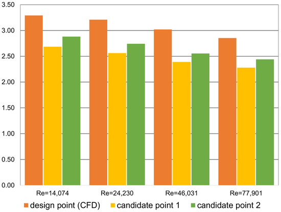 To derive suitable design points using the response surface, the objective function was set to minimize the TPLC; a screening optimization based on a simple sampling and sorting was used to find the two most suitable candidate design points. Figure 12 shows the comparison of the TPLC at the design point and two candidate design points for four Reynolds numbers. The first candidate point gave a significant improvement in the pressure loss of around 20%, except for 18.4% at the Reynolds number of 14,074 when compared to the design point; the second candidate point also gave an improvement of around 15%, except for 12.5% at the Reynolds number of 14,074. These clearly explained that the improvement was reduced at a low Reynolds number. Therefore, these results showed that the geometry change using the response surface would contribute to the pressure loss improvement.