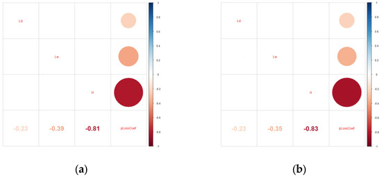 The correlation coefficient in a regression analysis indicates how closely the variables are related; the closer the correlation coefficient is to 1, the stronger the relationship. Figure 13 shows the strength of the correlation between the design variables and the output variable using the calculated data based on the DOEs for two Reynolds numbers; the TPLC was strongly negatively correlated with the tip-to-wall clearance in the two cases corresponding to two Reynolds numbers, and these trends were the same as those shown in Figure 11.