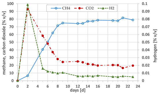 The carbon dioxide content reached its highest value after 2 days of the experiment, and was equal to 91.44% v/v and 92.90% v/v, in the mono- and co-fermentation tests, respectively. Regarding hydrogen, its maximum content was observed even after the first day of the process in the case of mon-fermentation and after 2 days of experiment in co-fermentation and was equal to 0.100% v/v and 0.098% v/v (in the mono- and co-fermentation tests, respectively).