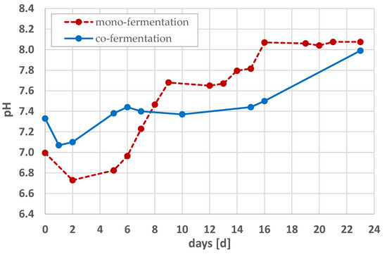 If the pH value is reduced below six, acidic fermentation starts to dominate, the trend of which results in an increase in hydrogen and carbon dioxide content with less methane content in the biogas. This type of fermentation is used to obtain hydrogen. The use of sludge acid digestion to produce hydrogen from sludge from a municipal wastewater treatment plant was presented by Gioannis et al. [37]. In this work, it was shown that the optimum pH for this type of process was between 4.5 and 6.0. During acidogenesis, organic acids such as butyric or propionic acid are formed, which are converted in methane fermentation to acetic acid and then to methane [38,39]. Methanogenic bacteria are particularly sensitive to the magnitude of the pH, with an optimum value of 6.5 to 7.2 [40]. For this reason, laboratory tests use NaOH, NaHCO3 or CaCO3 to correct the pH in methane fermentation. In the presented study, an initial pH adjustment was carried out with NaHCO3 to a value of 7.0 (for mono-fermentation) and 7.3 (for co-fermentation). In this way, conditions were created under which the fermentation process trended towards methane fermentation. The lowest pH values were recorded after 2 days and 1 day of the mono- and co-fermentation test and were equal to 6.73 and 7.07 (for mono- and co-fermentation, respectively), confirming that the applied conditions favourable for the trend towards methane fermentation were present.