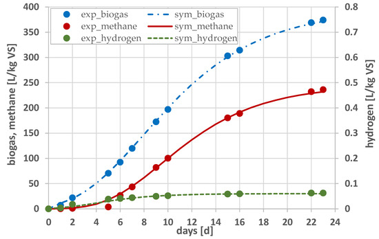 The calculated correlation coefficients R2 indicate a very good match between the experimental results and the simulation results (above 0.97). The maximum production value (‘am’) is one of the model parameters and refers to the maximum volume of a given gas that can be produced per unit VS. The simulation results showed that the maximum biogas production volume is higher for co-fermentation, compared with mono-fermentation, by 166.5%. However, for methane production, the values are similar. The correlations obtained from the model are opposite to the experimental results, where higher values were obtained for mono-fermentation. It should be noted, however, that the calculated values of the ‘am’ parameter refer to the situation where a plateau would have been obtained in both tests. The experimental results, on the other hand, indicate that such a situation would occur for different process running times. In the tests presented here, the process was run for 23 days. The simulation results indicate that the maximum biogas and methane production values would have been obtained over a longer period of time than the tests lasted. At the same time, the values obtained indicate that, in such a situation, the productivity would be higher for co-fermentation compared to mono-fermentation. For hydrogen, where a plateau was obtained, the maximum production value is 60% higher for mono-fermentation.