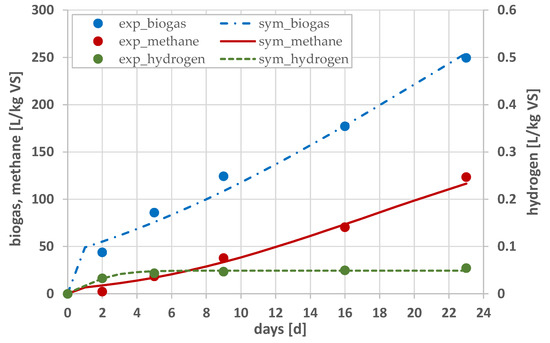 Accumulation curves for biogas components are useful for process evaluation but should be considered in relation to changes in the percentage concentrations of the individual components and the amount of biogas produced per day. Figure 5 and Figure 6 show the trend of the cumulative biogas, methane and hydrogen production curves per unit VS obtained from simulations with the Gompertz model in mono-fermentation and co-fermentation tests. The biogas and methane production curves for mono-fermentation approach a trend towards constant (plateau) values. For co-fermentation, on the other hand, they have a constant upward trend, indicating that the plateau for them will be reached after a longer retention time in the digester (more than 23 days). In the case of hydrogen, the accumulation reached a maximum value after about 4 to 10 days for mono-fermentation with a subsequent downward trend whereas for co-fermentation, the maximum is reached after only 4 days and stabilizes on this level till the end of a test process. This indicates that hydrogen is being used to generate methane. The parameter values of the Gompertz models, calculated using SCILAB, are summarised in Table 3.