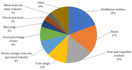Agricultural biogas production requires a constant supply of feedstock, with the result that the location of such biogas plants and their ability to process biomass is determined by the demand for the feedstock [4]. The composition, as well as the yield of the biogas produced from the biomass, depends on many factors, including the moisture content, the physical state of the raw material, the temperature and the technology used. Animal and vegetable feedstocks, as well as waste from the agri-food industry, can be used in agricultural biogas plants. To complement the basic feedstock that is used for biogas production, co-fermentation with other feedstocks has begun to be used, resulting in an increase in the amount of biogas produced or an increase in the proportion of methane. In some cases, several co-substrates are used that can be used as feedstock for biogas production. In addition, such solutions enable waste from the food industry and agriculture to be managed. An example is the co-fermentation of pig and cattle slurry with sludge from sewage treatment plants and waste from agriculture and the food industry [5], cattle waste with corn silage [6], pig waste with grass silage [7], solid waste with biomass [8], sewage sludge with pig manure [9], and food waste with sewage sludge [10].