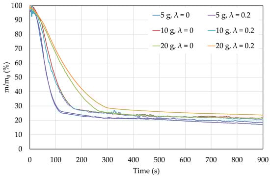 | λ | Sample (g) | Devolatilization | Residual Carbon | |||