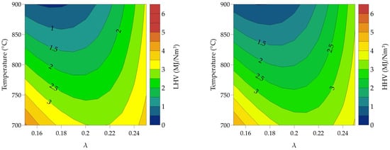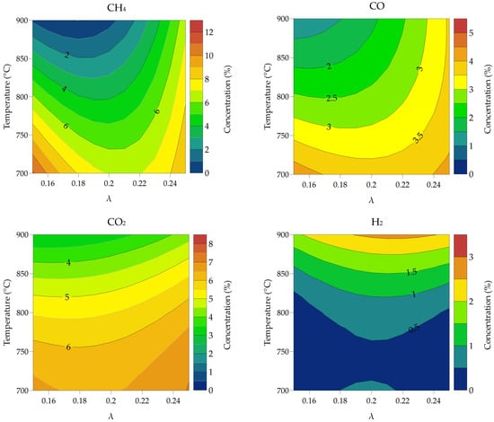 | Temp (°C) | λ | CH4 (L/kg) | CO2 (L/kg) | CO (L/kg) | H2 (L/kg) |
