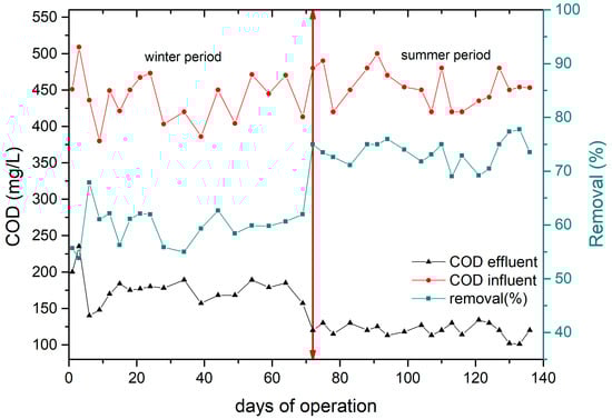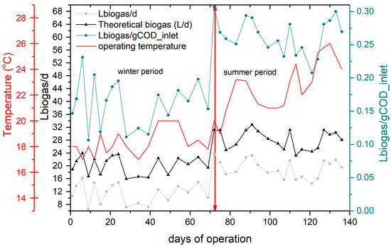 Biogas production, as well as L biogas produced/COD inlet for winter and summer periods, is presented in Figure 3. Average biogas production, expressed in L/day, increased during the summer period and reached an average value of 0.47 L/g COD removed, while biogas production decreased to 0.39 L biogas/g COD removed during the winter period. Similarly, [62] reported a biogas production in the 0.42–0.48 L biogas/g COD removed range.