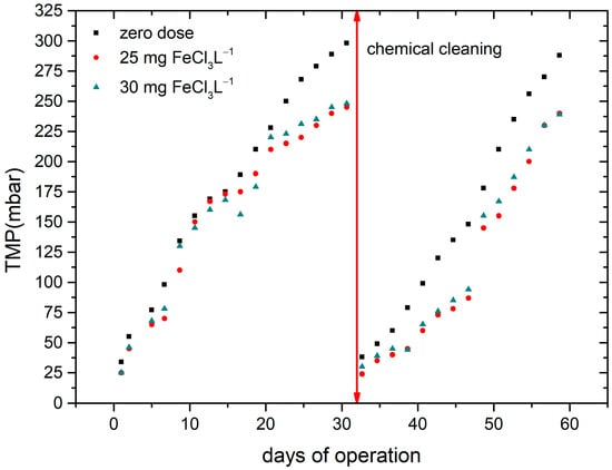 In addition, as shown in Table 6, iron addition resulted in increased mixed liquor suspended solid (MLSS) concentrations due to chemical P removal and the formation of iron phosphate salts. The analysis revealed a 20% increase in the value of MLSS due to iron addition. This finding highlights a potential environmental problem regarding the formation of ferric-rich sludge, which could restrict disposal or reuse alternatives [64,65]. Furthermore, due to iron addition, membrane fouling was mitigated. As reported in [66,67], coagulant addition introduces positive charges, neutralizing the negative charge of activated sludge flocs and thus favoring flocculation and reduction of colloidal matter. The addition of ferric chloride concentrations of 25 and 30 mg FeCl3 L−1 significantly lowered the biomass pH to 6.7 and 6.6, respectively. It is expected that higher ferric doses will require pH adjustment in order to avoid unacceptably low values that would inhibit biomass growth [67].