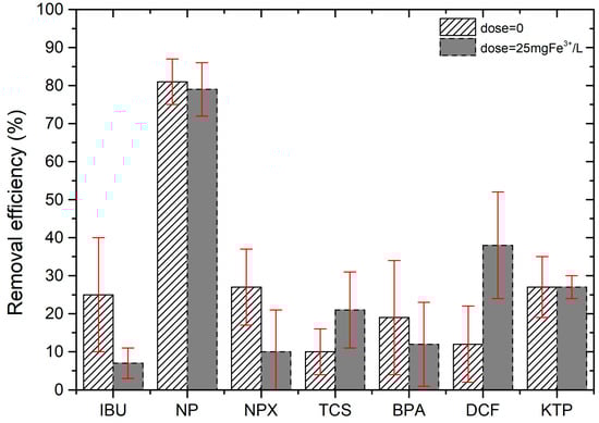 In our study, the effect of iron addition on micropollutant removal in the AnMBR was investigated by monitoring influent and effluent micropollutant concentrations. Specifically, seven organic micropollutants—nonyphenol (NP), triclosan (TCS), and bisphenol A (BPA) from the EDC group and ibuprofen (IBU), naproxen (NPX), diclofenac (DCF), and ketoprofen (KTP) from the NSAID category—were measured with 25 FeCl3 mg/L and without iron addition. The results of the removal efficiency for the target compounds are shown in Figure 6.