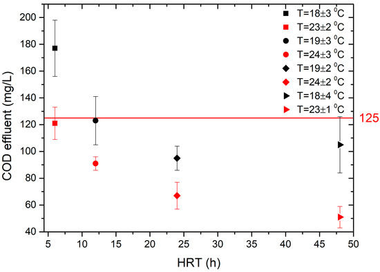 Figure 7 shows COD effluent values for the winter and summer periods for three different HRTs studied in a previous paper [54], in combination with the HRT of 6 h studied in this paper.