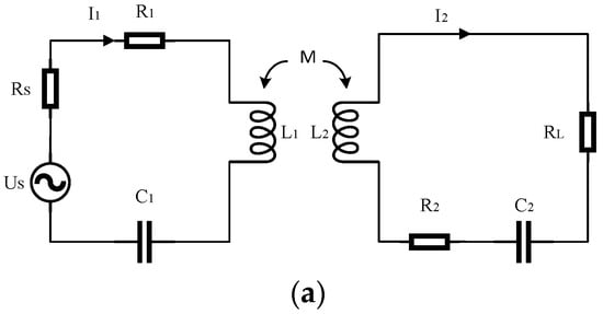 The multicoil WPT could be used to improve the distance of the WPT. The three-coil magnetic coupling resonant WPT system contained three different coils, which were the transmission coil connected to the high-frequency power supply, the relay coil, and the receiving coil with a load. As shown in Figure 8, based on the mutual inductance theory, the equivalent circuit model of the system was established by using the SS topology structure.
