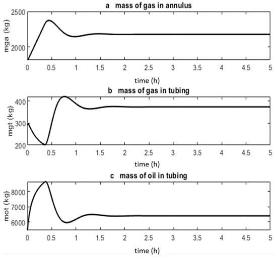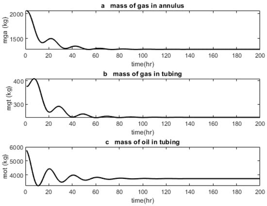 States of a gas-lifted system for in a stable mode. These states are the mass of the gas in annulus , mass of the gas in tubing and mass of the oil in tubing . All three states are positive, including other algebraic variables of the system. The states converged to fixed values as there was no oscillation.