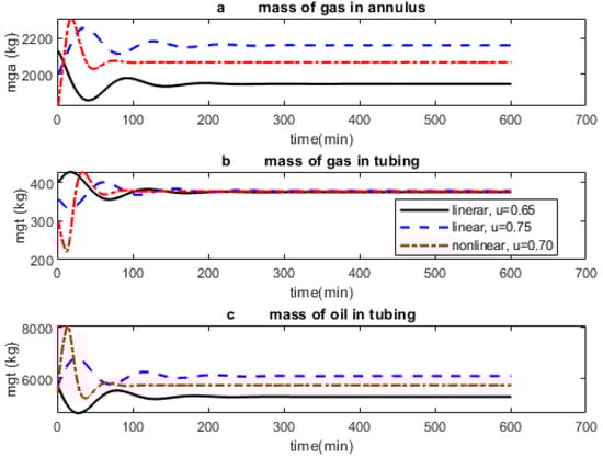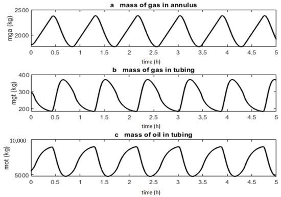 The DAE system is solved using ODE15s in MATLAB using the data provided in the appendix of [33]. To simulate the existence of casing-heading instability and to ensure a consistent solution to the DAE for the selected initial conditions, the flowrate into the annulus and GOR were altered. The input is u = 0.65 (65% valve opening), while (flowrate into the annulus) is fixed at 0.4 kg/s. Starting from the initial condition of = kg, and with GOR fixed at 0.01, the system is simulated over 5 h. For a GOR of 0.01 (shown later), the system remains in a stable mode till the inputs become u = 0.75.
