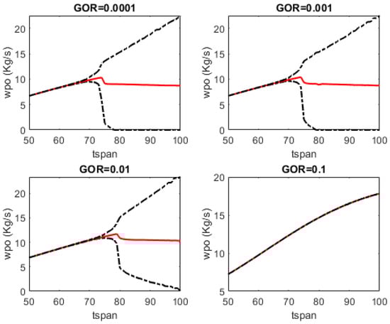 The dynamics of the gas-lifted system are highly dependent on the parameters. One of these parameters is the GOR, and the parameter within our control is the input, which is the percentage valve opening when we consider one input or flowrate into the annulus as a second input. By parameterising the input, we can observe the behaviour of the gas-lifted system output as the input changes from u = 0% (0.00) to u = 100% (1.00). This reveals the critical point at which the system changes from a stable to an unstable oscillatory regime. This critical point is GOR-dependent, as shown in Figure 4 for GORs of 0.0001, 0.001, 0.01 and 0.1, respectively. The black dashed lines are the minimum and maximum flowrates of produced oil, while the red solid is the average flowrate.