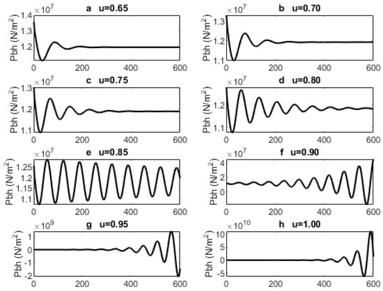 For the unstable regime, we use a choke opening of 95% (0.95), which falls into the unstable region. Figure 3 shows the oscillating states of the system. The system oscillates with a period of about 53 min (0.88 h). All algebraic variables of the gas-lifted system also show oscillatory behaviour. This period can be as low as 100 s (1.7 min) on a laboratory scale to a few hours in some fields [22]. Further simulations show that any input such that will produce a gas-lifted system that is completely stable. For , there is slight oscillation. However, the bifurcation point is at u = 0.80 after which the system goes into oscillation.