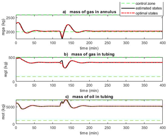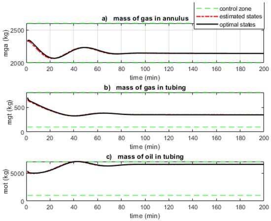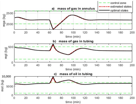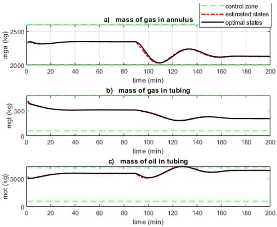 Figure 7 shows that the control zones are respected. The controller can enforce zone control for narrower control zones but at the expense of a low-optimal input sequence, which results in a low oil production rate. Hence, for an adverse case where the controller is unable to stabilise the oscillatory behaviour, the lower bound of can be increased to a limit dictated by the annulus volume, while the upper bounds of and can be decreased. This will jeopardise feasibility as the control zones will be narrower. The estimated states (red long-dotted line) are seen to converge to the optimal states (dark continuous lines) obtained from the actual measurement. This shows the performance of the EKF.