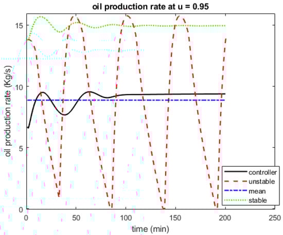 Figure 8 is the oil production rate at 95% valve opening (u = 0.95). The optimal production from the controller (black solid line), unstable production (red dashed line) and mean production (blue dash-dotted) were obtained at GOR = 0.01, while the stable production (green dotted line) was obtained at GOR = 0.4. The mean production is the average production when the gas-lifted system is in the unstable region at u = 0.95. The steady-state optimal production rate from the controller is 9.38 kg/s, while the mean production is 8.88 kg/s, and the stable oil production is 14.95 kg/s. If the reservoir parameter’s GOR is high enough to keep the gas-lifted system in stable mode, oil production will be at its highest rate for an input u = 0.95. However, if the GOR is not sufficient enough to naturally remove the instability at the given input, NMPC is better. The NMPC increased steady-state oil production by 5.63% over mean oil production when the gas-lifted system is operated at u = 0.95.