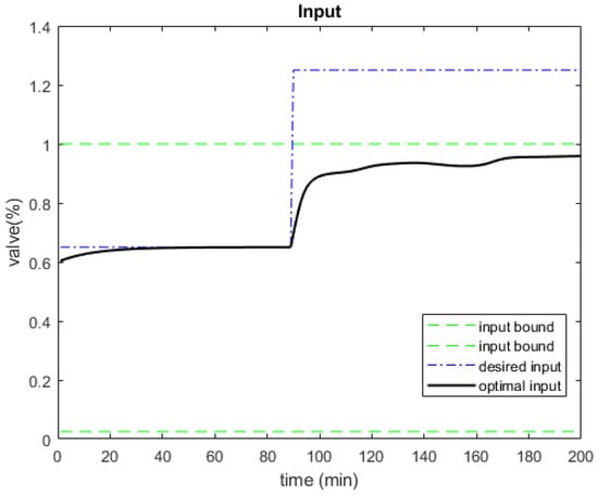 When it is desired to approach the input limit as close as possible, the input from RTO is no longer selected as the desired input. Since this controller respects the control limits, a desired input outside this limit was selected to force the optimal input close to the control limit without violating the control limit. We start with = 0.65 and switch to = 1.25 (which is out of the control limit) after 90 min (1.5 h). Figure 9 shows the states of the system, while Figure 10 and Figure 11 show the input target and cost function, respectively.