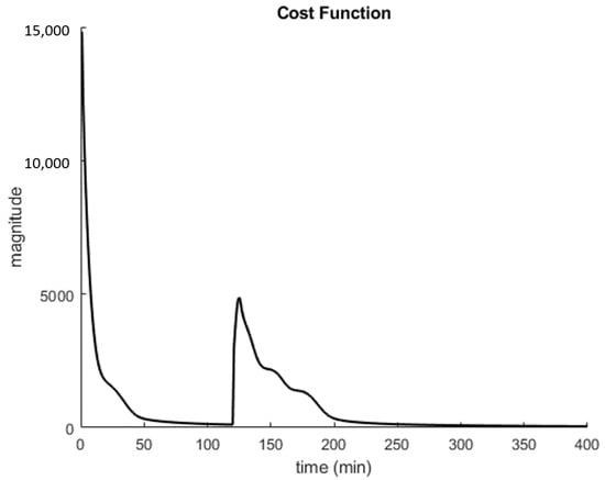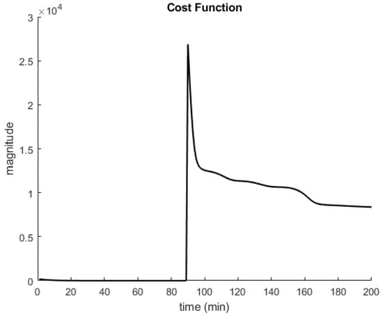 Control cost function for the gas-lifted system. The first part corresponds to the time before the disturbance’s arrival, and the second part corresponds to the part after the disturbance’s arrival. The cost function decreased to a value permitted by time for the first part but decreased to zero for the second part
