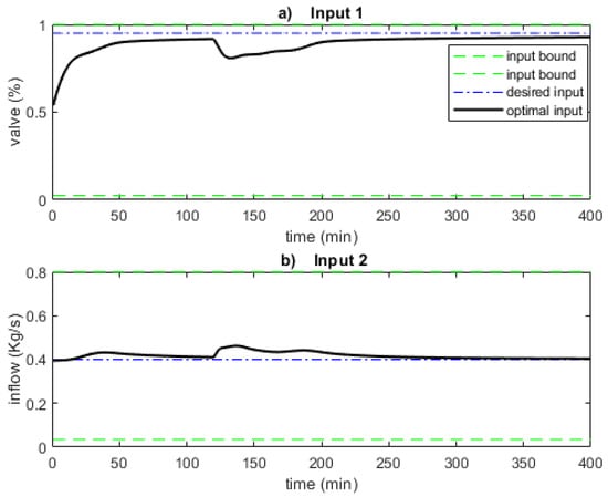 Most control solutions to operate a gas-lifted system use only one input (the production choke) to control the flow through the system. The flow into the annulus () is usually fixed by a regulatory controller (mostly PID), and the set point depends on the available gas from the compressor station. In a few cases, both valves are manipulated to control the flow in a multivariable approach for optimal operation, as shown in [30,37]. We examine the effect of the additional degree of freedom on disturbance attenuation and improvement of the oil production rate. All the values in the one input case are retained, but , which is fixed in the one input case, is here an input where the desired value is given as = 0.4 kg/s. Further, the simulation time is 400 min to give room for the inputs to converge to the desired values. Figure 13 shows the two inputs, and Figure 14 shows the corresponding cost function.