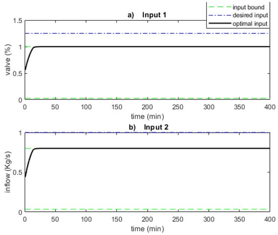 The state plot is almost identical to Figure 12; hence it is not shown here. This is due to the controller being able to fix the second input at almost the constant value of u = 0.4 kg/s in Figure 14, which is the value of the in the one-input case. The first optimal input, therefore, approaches the optimal input corresponding to Figure 12, hence the state trajectories are almost identical.