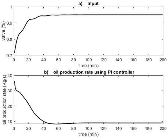 Input and output of the gas-lifted system using PI controller. The PI controller opens the valve gradually from the equilibrium point to , which is in the unstable region, making the oil production steady at 9.03 kg/s.