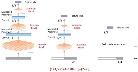As a result of sparse self-attention, the feature map obtained by the encoder contains many redundant combinations of V values, and the feature map can be reduced by extracting some dominant features through convolution and pooling, a step called Distilling in Informer []. The equation for the distillation operation to transform layer j to layer j + 1 is as follows: