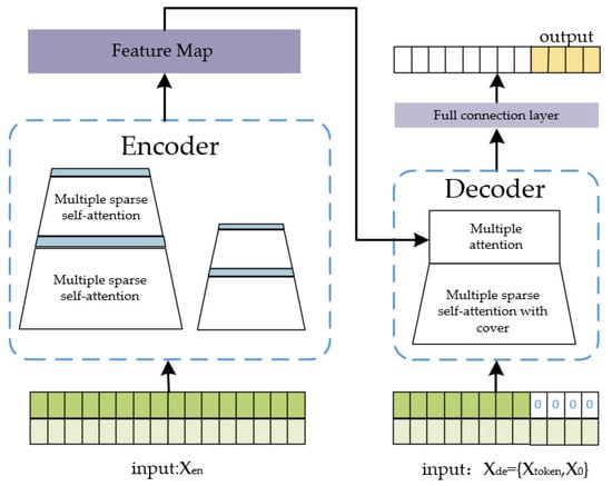 where represents the attention block, which is exactly the same structure as the attention block in Transformer, except that the multi-headed self-attention layer is replaced by a sparse multi-headed self-attention layer. Figure 3 shows the structure of the encoder part.