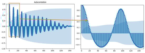 Electricity load is somewhat cyclical, following the previous rule of variation, and the load data within a certain period have a certain correlation. Due to the large dataset, in order to explore the autocorrelation of electric loads, Figure 7 selects the load data of Taoyuan substation in Nanchang City, which records the electric-load data every 15 min, and selects 1440 data, i.e., one month’s electric load, and draws the following electric-load autocorrelation coefficient graph.