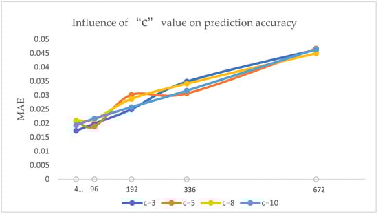 The number of times to calculate the dot-product pairing is determined by μ, which is determined by the hyperparameter c, i.e., . An increase in the value of c means that the number of dot-product calculations is also increasing, which then inevitably leads to an increase in prediction accuracy and a decrease in prediction efficiency. In order to investigate the effect of the hyperparameter c on the results in the following experiments were carried out on c. The experimental results are shown in Table 4.