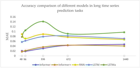 From the experimental results, we can see that the training accuracy of Informer and Informer+ is significantly improved compared to the RNN, LSTM and LSTMa models. Informer and Informer+ showed excellent prediction performance on the 0–672 step prediction task and significantly outperformed other models in terms of prediction accuracy on longer time-series-prediction tasks. The prediction accuracy of both models decreased with increasing time steps until the prediction slowly stabilized after 672 time steps. However, due to the limited conditions, it was not possible to conduct a longer time-step test, so the prediction performance after 1440 points is not discussed in this paper.