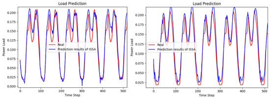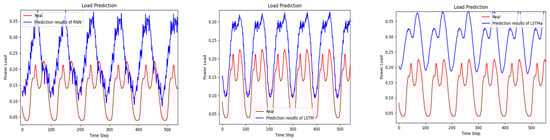 Figure 10 and Figure 11 show the predicted results of the five models above compared to the true values at 500 time steps of prediction. The comparison graphs show visually that the two models Informer and Informer+, which are based entirely on the self-attention mechanism, fit the load curves more accurately, and the predicted and true values show a consistent trend, while the predicted values of RNN, LSTM and LSTMa based on recurrent neural networks were significantly higher than the true values. The LSTMa model had a higher MAE score than RNN and LSTM but was smoother than the above two models, fluctuated synchronously with the real load, and was significantly more usable than the RNN and LSTM models after data correction in the vertical direction.