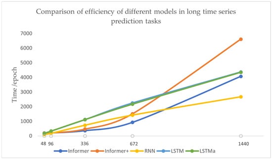 In terms of computational efficiency, RNN, LSTM and LSTMa can all be expressed in an approximately linear relationship between the number of prediction steps and the prediction time due to their serial computation characteristics and the nature of the distance between points as L. The RNN model benefits from its simplest structure and has a significantly lower slope of prediction-time rise with increasing prediction time steps than the LSTM as well as the LSTMa. The prediction time-step–time relationship curves for Informer and Informer+ are a concave function, and it can be approximated from the measured data that the efficiency of Informer is higher than the other models mentioned above within a certain prediction time step. This interval is defined here as the high-efficiency interval, which is of great practical significance in practical engineering. It can be seen from Figure 12 that the high-efficiency interval for both Informer and Informer+ is higher than 672 time steps. If 96 data are available in a day, it corresponds to more than one week of power-load data, which is sufficient to cover most short-term power-load forecasting scenarios. The predicted time-step–time relationship curve of Informer+ also presents a concave function, but the slope of the training-time rise with increasing time steps is much larger than that of Informer because of the reduced distillation operation, which results in a larger amount of data. This makes Informer+ significantly less efficient as the predicted time points increase, and less effective than Informer in practical engineering applications.