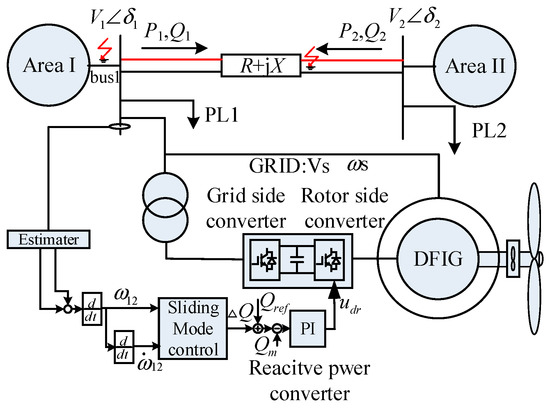 In this paper, reactive power is modulated as a sliding-mode control variable for inter-area oscillations. The DFIG’s reactive power does not abruptly change because sliding-mode control calls for discrete control actions. As a result, it is not possible to perform direct control actions using reactive power. The reactive power is controlled using a dual-loop PI controller, which consists of an outer reactive power loop and an interior current loop [22]. Figure 2 depicts the control scheme that the DFIG reactive power reference Qref can be the actual control action used for the sliding damping control. If reactive power is used directly in the control loop, the relative degree can become significant. Therefore, the reactive power control loop’s dynamic variables use a first-order inertia loop. That allows the designed control to perform better in terms of control robustness to bounded systems.