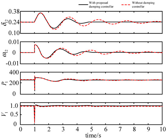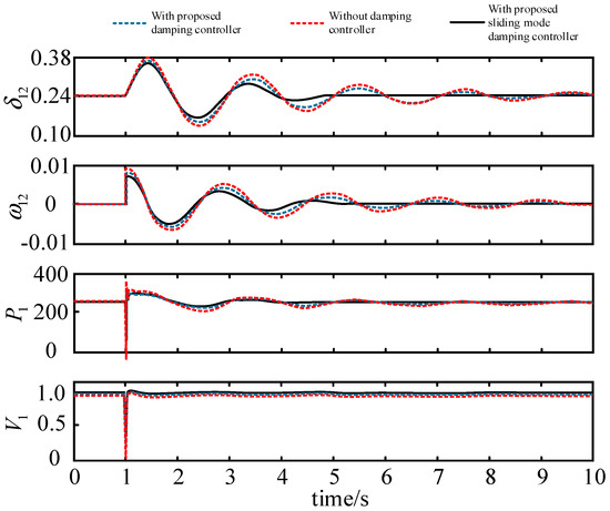 From the dynamic responses in Figure 8 and Figure 9, it can be seen that the reactive power deficit in the system is significantly improved after the introduction of the damping control. However, the fluctuation time when returning to normal value in response to the dynamic response is not effective, while the time from the system to the return to stability is shortened after the introduction of the sliding mode improved damping control, which proves that the loop is effective in responding to the fluctuation of the system.