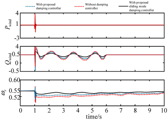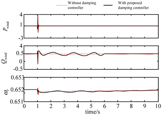 Figure 7 depicts the transient performance of the DFIG, indicating that the proposed damping control scheme has essentially no influence on the active output power and motor torque of the DFIG.