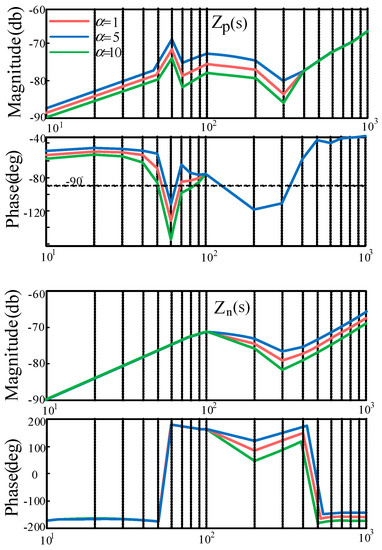 The frequency response of the output impedance is shown as a plot in Figure 11, where the value of goes from 1 all the way up to 10. Larger values increase both the impedance amplitude and the phase shift by more than ninety degrees when they are close to the fundamental frequency. The reliability of the system is compromised as a result. The values of α and β thus selected are given in Appendix A.