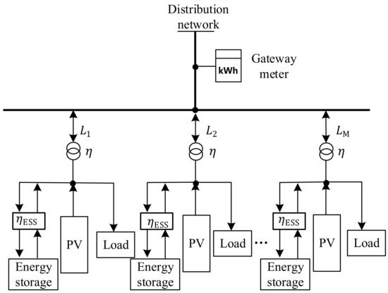 Currently, industrial parks typically install many transformers to suit the electricity needs of businesses due to the park’s growing electricity consumption as well as improving power supply reliability. A user-side multi-transformer-integrated microgrid structure is formed when all transformers complete the electricity metering through a two-way gateway meter, as shown in Figure 1. All PV and ESS property rights and advantages are owned by users of the multi-transformer system behind the meter, and they are all managed by users in a unified and coordinated manner. The PV and ESS are installed beneath the transformer to create a new energy power supply node, with PV and ESS participating in the energy supply. The transformer is situated behind the gateway meter. To enable the sharing of ESS and PV across each node, the tie lines, L1, L2, …, and LM, connect each power supply node to the gateway.