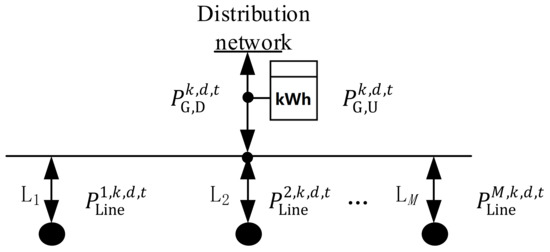 To measure the purchased power and on-grid power, a two-way gateway energy meter is required since the on-grid price is different from the TOU price of the power grid. and , which are the purchased power from the upper grid and sold power to the upper grid, respectively, of the park hour t of dth day in month k, should be collected by the two-way gateway meter. That is, if the park purchases power from the upper grid, then ; if the park sells power to the upper grid, then ; and if the park power can be self-sufficient, then . Thus, we have: