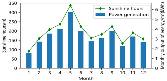 The accessible area of the roof of the plant and office building on the user side of the industrial park restricts the installed capacity of the PV power-producing components. Currently, 350 kWp, 390 kWp, and 150 kWp of PV capacity are installed on the user side of the three transformers in the industrial park. Following the principle of spontaneous self-use and residual power access, each one of them connects to the load via a PCS inverter. The typical PV production statistics of the four seasons can be calculated based on the features of the Northern Hemisphere lighting, seasonal illumination characteristics, and monthly average sunshine hours [28,29]. The annual total radiation in the region’s horizontal plane can be calculated to be 1314 kWh/m2, as shown in Figure 3, which shows the monthly statistics of light and power generation in the area, based on NASA satellite monitoring data.